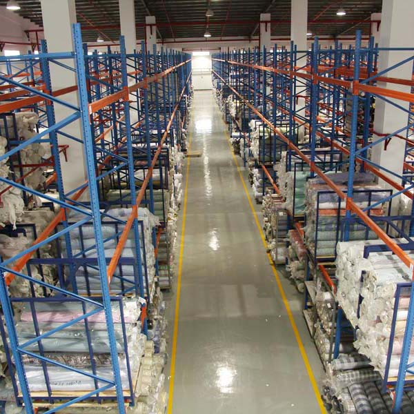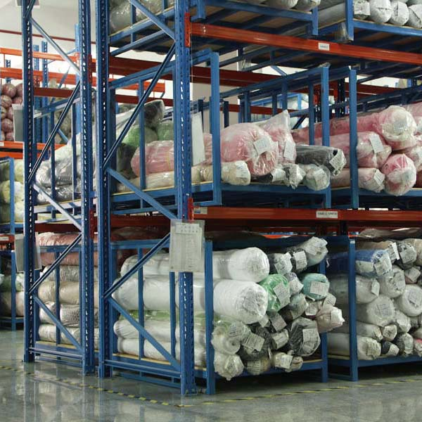 布匹放在柱式托盤(pán)上,就不會(huì)輕易滑落,比直接放在橫梁上安全很多。兩者貨架形式的結(jié)合,既保證了布匹的存儲(chǔ)轉(zhuǎn)運(yùn)方便,同時(shí)也保證了貨物的安全。另外,在產(chǎn)能加大存儲(chǔ)量加大的情況下,實(shí)際上橫梁貨架和柱式托盤(pán)也可以單獨(dú)使用。至于成品服裝,則統(tǒng)一通過(guò)層板貨架來(lái)存放,疊放件直接整齊碼放在層板上,而掛放件則直接通過(guò)衣架掛在橫梁上。